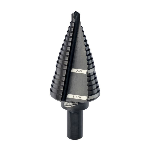 Milwaukee step drill bits with jam-free performance feature a dual-flute design delivering up to 2X faster hole times, up to 4X longer life and up to 50% more holes per battery charge than the competition. Ideal for drilling large and small-diameter holes in steel and plastic, these bits are optimized for cordless drills in high speed. The Rapid Strike tip allows for fast, accurate starts that generate less heat, resulting in longer bit tip life. Black oxide coating also enhances durability, hole quality and bit life. For user convenience and accuracy, each bit has laser-engraved reference marks you can see while drilling. The 3-flat Secure-Grip shank ensures a solid connection with the drill chuck. The #9 step drill bit has 2 hole sizes: 7/8 in. and 1-1/8 in.. jam-free performance in high speed with most professional 18 Volt cordless drills with lithium-ion battery technology.
