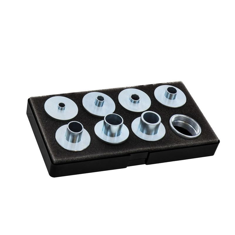 The Milescraft MetalBushingSet is comprised of seven carbon steel one-piece bushings, two locknuts, one top hat adaptor, and a wave washer. The router bushings have outer diameters of 5/16in, 3/8in, 7/16in, 1/2in, 5/8in, 3/4in, and 51/64in. This router template guide set comes in a locking storage case with a peg hook and a foam insert to keep the accessories in position. Compatible with all router sub-bases with a 1-3/16in (30.2mm) center hole diameter and can be used with all Milescraft TurnLock products. These guide bushings are great for use when dovetailing, sign making, and inlay routing.
