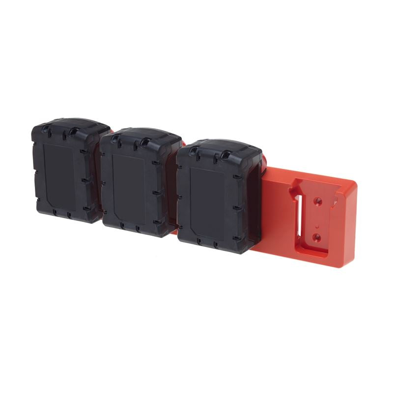 Use this holder to easily mount four 18V Milwaukee batteries to your wall, under your workbench or in your trailer or van. Batteries clip in using the existing locking clip, so can be mounted in any direction.
