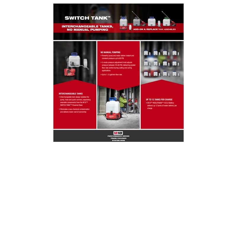 The Milwaukee M18 SWITCH TANK 4 Gallon backpack water supply kit is the industrys first interchangeable tank design with no manual pumping. Designed to meet water supply needs for concrete cutting and coring, the battery-powered water supply delivers instant, constant and adjustable pressure up to 60 PSI. The 5-mode pressure adjustment knob adjusts the pressure between 20 60 PSI for ultimate control. The M18 REDLITHIUM XC3.0 battery provides up to 12 tanks of water delivery per charge. The 4 Gallon water supply tank assembly has a dual diaphragm pump for increased durability and longer pump life. The tank also has a wide mouth opening for easier pouring and a strainer that filters debris from getting into the tank. The backpack frame includes wide straps and a handle for convenient transportation and storage. The 4 Gallon water supply is made up of two components the M18 SWITCH TANK powered base and the SWITCH TANK 4 Gallon water supply tank assembly. The powered base includes the motor, battery compartment, and REDLINK electronics. The interchangeable tank assembly includes the pump, 10 ft hose, and quick-connect. The isolated pump, hose, and quick-connect design allows tank assemblies to be added for different applications, eliminating cross-chemical contamination. It also allows tank assemblies to be replaced at a lower cost of ownership compared to replacing the entire water supply. The powered base is also compatible with the SWITCH TANK 4 Gallon concrete sprayer (49-16-28CS) and 4 Gallon sprayer (49-16-28PS) tank assemblies. The M18 SWITCH TANK 4 Gallon backpack water supply is part of the M18 system which is fully compatible with over 175 tools. The kit also includes one M18 REDLITHIUM XC3.0 battery and an M18/M12 multi-voltage charger.