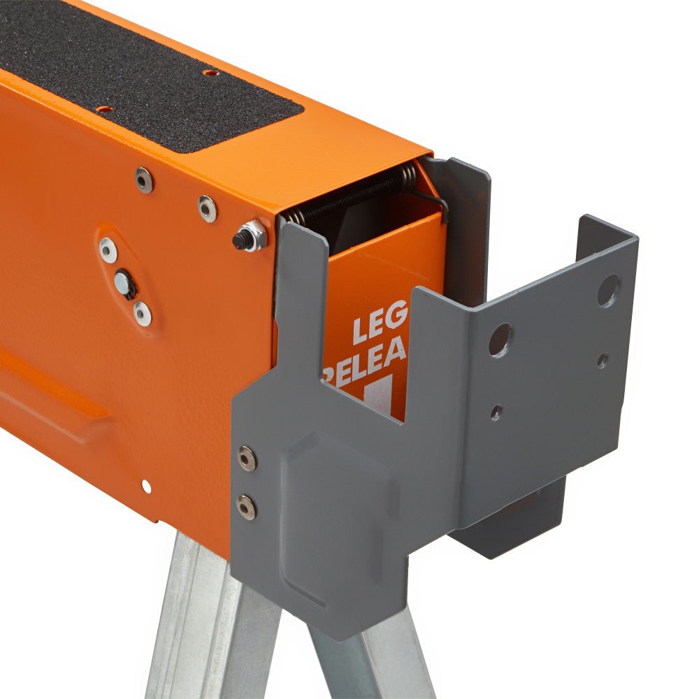 The BORA Workhorse XT is a professional-grade adjustable sawhorse built for strength and versatility. With a 1350 lb. (612kg) capacity per sawhorse 2700 lbs. per pair, (612kg) and height adjustment from 30″ to 34″ in 1″ increments, it adapts to any job. Durable steel construction ensures long-lasting performance, while foldable legs make transport easy. Includes pre-drilled tops, end brackets for 2×4 attachments, and a bonus built-in bottle opener.