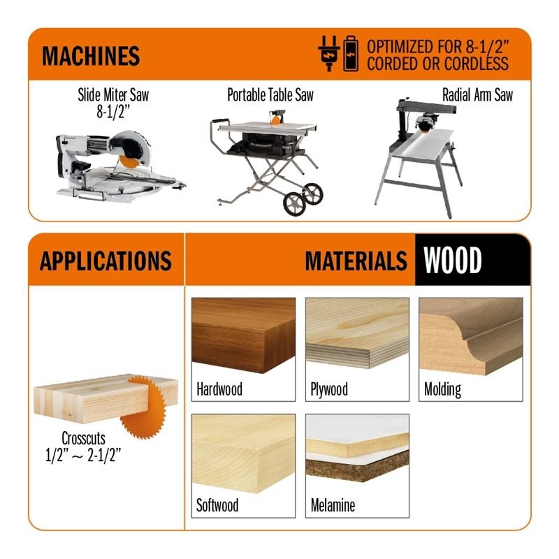 Optimized for 8-1/2 in corded or cordless sliding miter saws, portable table saws and radial arms saws.