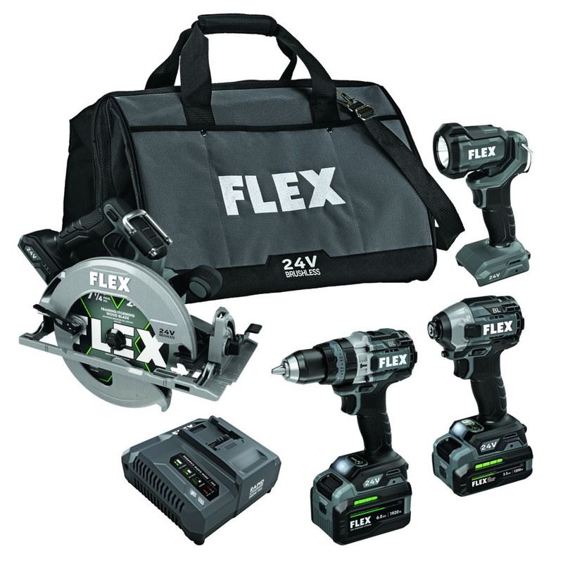 FLEX FXM403-2G 24V 4 Tool Stacked-Lithium Kit, Turbo Hammer Drill, Quick Eject Impact Driver, 7 1/4 Circ Saw and Work Light