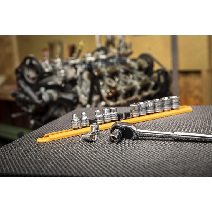 GEARWRENCH sockets are manufactured from alloy steel for maximum durability and strength. Our off corner loading design reduces fastener rounding and the chamfered opening help guide the socket on to fasteners. The 14 piece 3/8" Drive 6 Point Metric Standard Length Socket Set includes sizes: 6mm, 7mm, 8mm, 9mm, 10mm, 11mm, 12mm, 13mm, 14mm, 15mm, 16mm, 17mm, 18mm, & 19mm and includes a socket rail for storage & organization.
