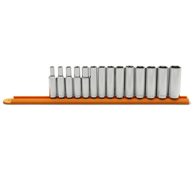 GEARWRENCH sockets are manufactured from alloy steel for maximum durability and strength. Our off corner loading design reduces fastener rounding and the chamfered opening help guide the socket on to fasteners. The 14 piece 3/8" Drive 6 Point Metric Deep Length Socket Set includes sizes: 6mm, 7mm, 8mm, 9mm, 10mm, 11mm, 12mm, 13mm, 14mm, 15mm, 16mm, 17mm, 18mm, & 19mm and includes a socket rail for storage & organization.