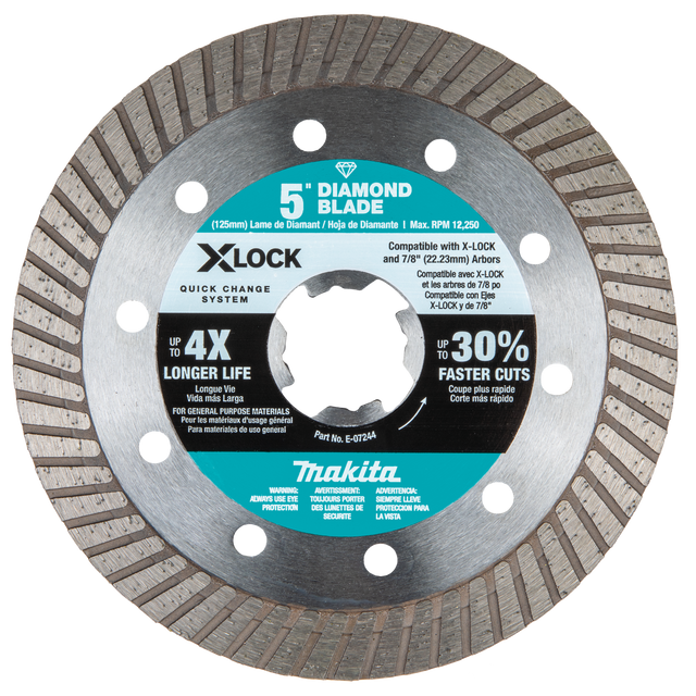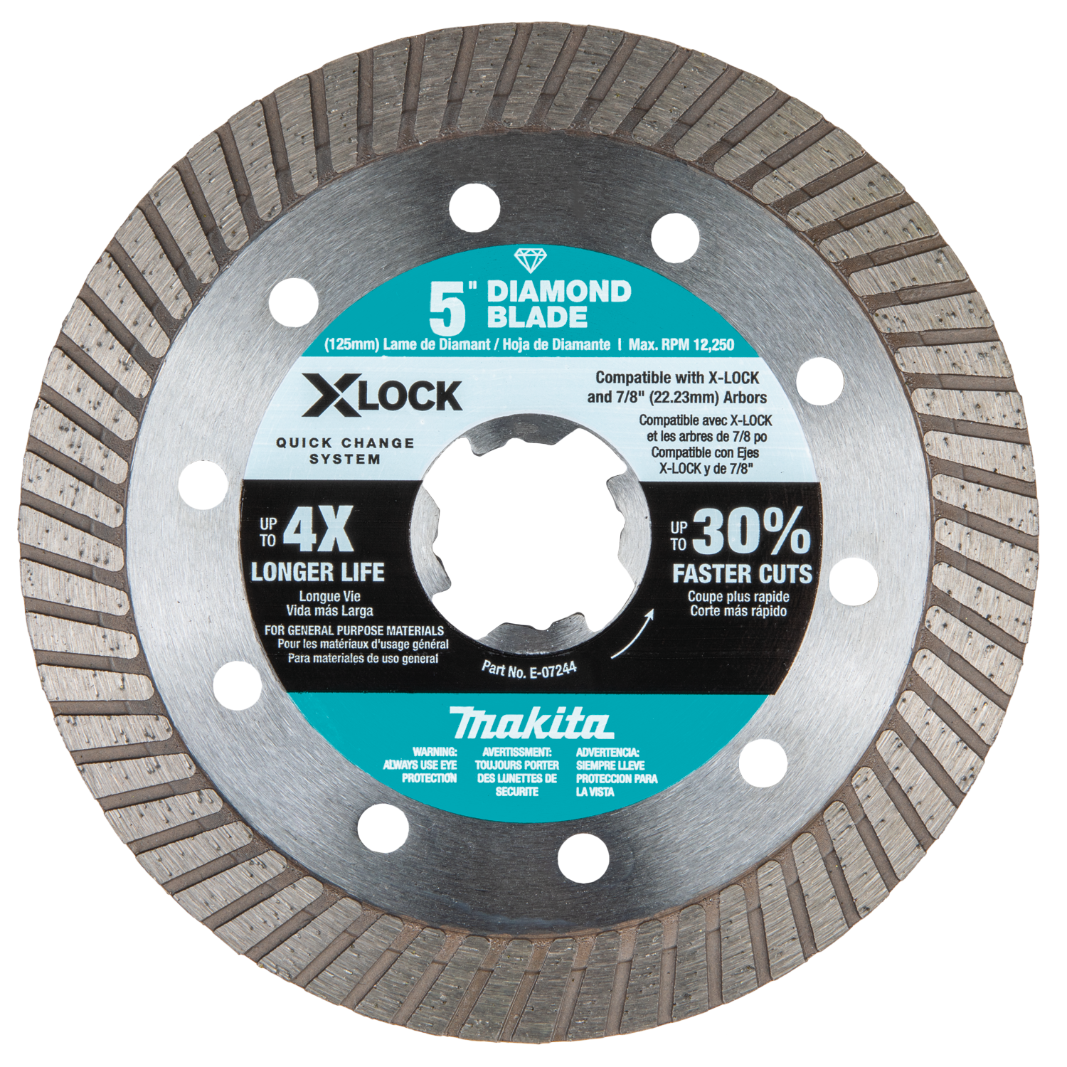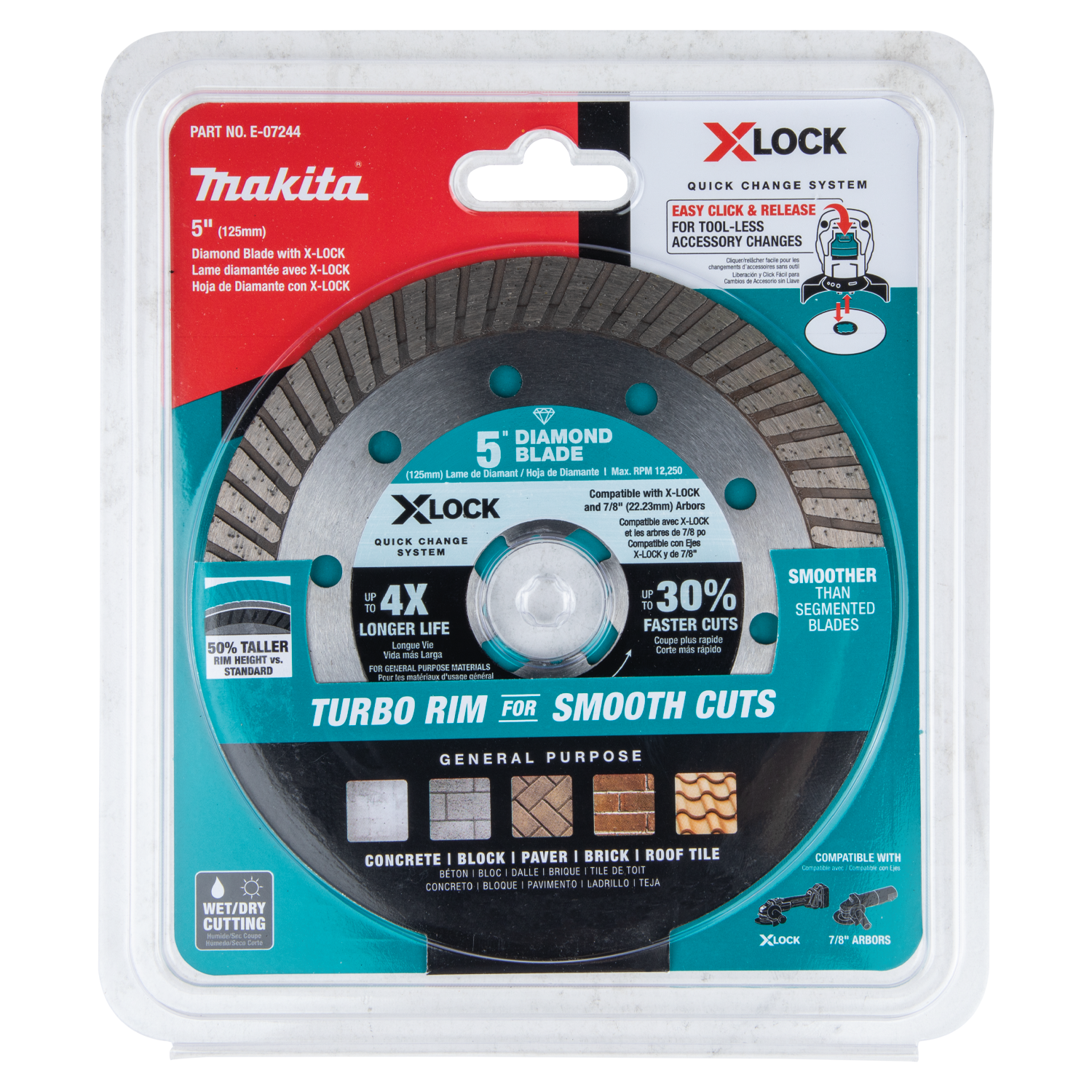 The X-LOCK Quick Change System provides up to 5X faster blade changes. The X-LOCK 5” Turbo Rim Diamond Blade (E-07244) is designed for masonry cutting, including concrete, block, brick, pavers, and roof tiles. It is made with high-quality diamonds, carefully tensioned for less vibration, and features a turbo rim for faster and smoother cutting. The blade can be used for dry or wet cutting. X-LOCK quick change system also allows for easy tool-free blade changes by simply pulling the release lever on Makita® X-LOCK Angle Grinders (sold separately).