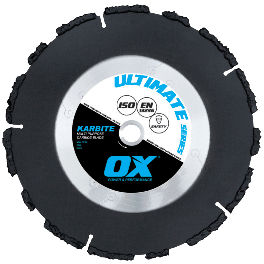 The OX Ultimate KARBITE is a multi-purpose saw blade made up of carbide clusters welded to a reduced noise and vibration center plate which can cut equally well in either direction and can rip through many products which cannot be cut using a diamond blade or chainsaw. For a blade that’s got some bite, the KARBITE gives a remarkably even cut in many products from time to plastic, tree roots to rubber and is not put off by nails or screws! As it is bi-directional, the KARBITE does not need to be sharpened – simply turn it round and carry on cutting. Can be used with gas cut-off saws and angle grinders.