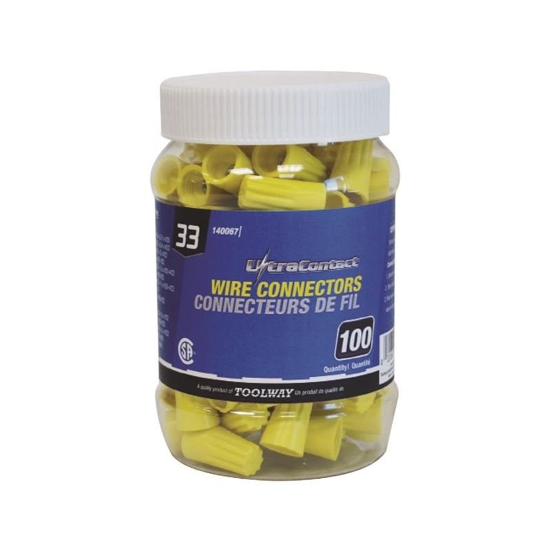UltraContact Wire Connectors are perfect for all your termination needs. These twist-on wire connectors feature a tactile grip design for the easy twist and termination of wires, even when wearing gloves. Creating terminations will now be swifter than ever. The connector shell is lined with a current carrying thread to ensure a sound and secure positive connection between adjoining wires. The rugged outer shell is thermoplastic and flame-retardant allowing it to withstand the harshest of environments, ultimately protecting your electrical infrastructure. UltraContact Wire Connectors are CSA-listed and have passed extensive tests that align with Canadian electrical standards. Specifications: yellow in colour; size medium; size number 33; 100 pieces per jar.