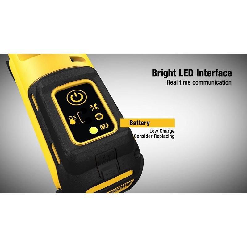 Onboard diagnostics indicates battery state of charge, successfully completed cycle, service needed, and operating termperature range of the tool