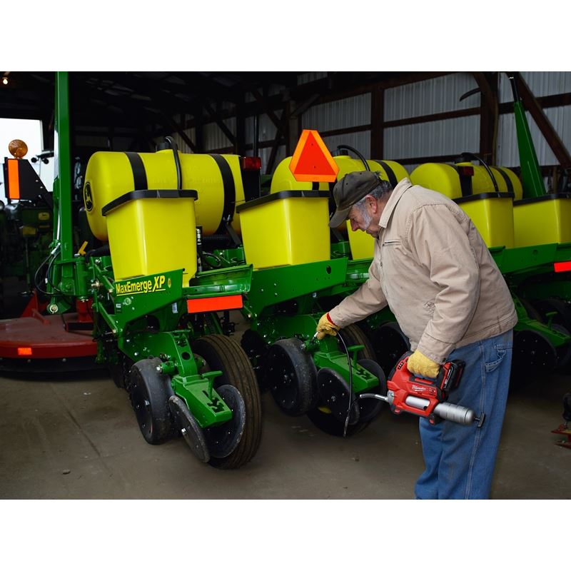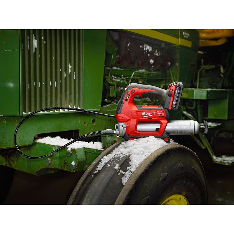 The M18 cordless 2-speed grease gun delivers maximum pressure and unmatched versatility, offering an industry leading 10,000 PSI max operating pressure and a patent pending pre-set grease counter that allows service and maintenance professionals to dispense precise amounts of grease. The tools 2-speed design offers users the ability to select between max pressure and max flow rate. Other unique features include an on-board LED light, a lock-on/lock-off trigger, and a plunger rod with markings to gauge how much grease is left in the barrel. The tools stand up design and shoulder strap capability offer user convenience, while limiting fatigue and the 48 in. flexible hose offers greater accessibility when greasing hard to reach fittings. The new tool is also compatible with a clear barrel accessory (49-19-2646). Powered by an M18 REDLITHIUM battery pack, this is the industrys only 18 V grease gun thats battery is compatible with a system of tools. The kit includes the new multi-voltage charger, so you can charge all M12 and M18 lithium-ion batteries with one charger.