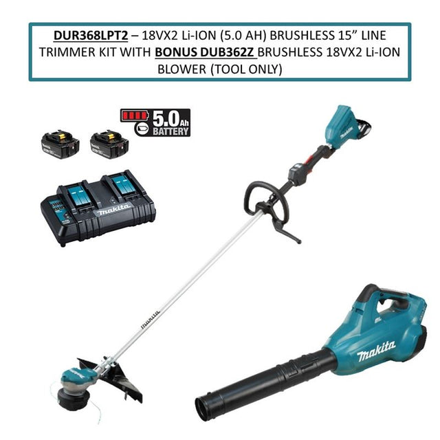 DUR368LPT2 18VX2 (36V) Li-Ion (5.0 Ah) Brushless 15 in Line Trimmer Kit with Bonus DUB362Z (18VX2) Turbo Brushless Blower (Tool Only). INCLUDES: Tool, Two pcs of 5.0 Ah Batteries and Dual Port Rapid Charger. Bump & Feed Trimmer Head (197296-3), Protective Guard (459504-3), Safety Goggles (195246-2), Shoulder Harness (125516-5), Hex Wrench 4 (783202-0), Hex Wrench 5 (783217-7), Accessory Bag (831304-7)