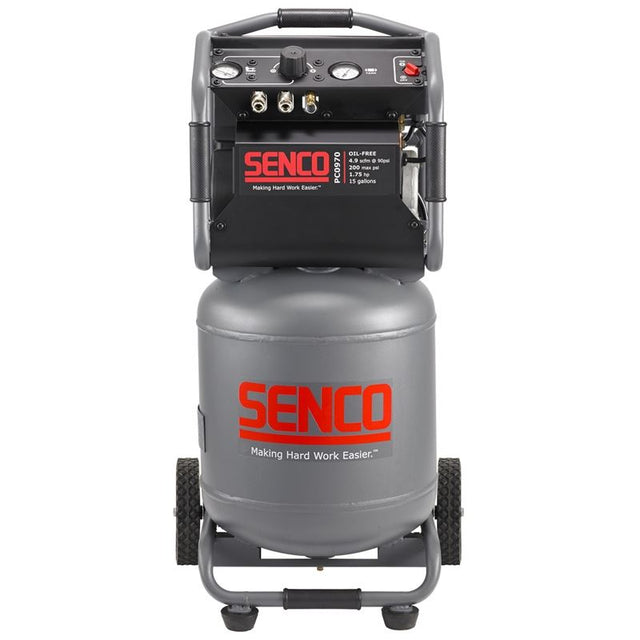 SENCO's 15 Gallon Vertical air compressor is an extremely versatile unit. The multiple grip points and rugged construction allow this unit to be used on the jobsite or in the shop. The long life induction motor and oil free pump design provide excellent air flow without the need for oil and maintenance.