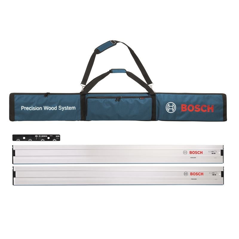 Convenient 63 In. Tracks and Connector Kit – collected to get started with the Bosch Track Saw (sold separately), featuring two FSN1600 63 In. (1600mm) tracks, an FSNVEL connector and a track bag