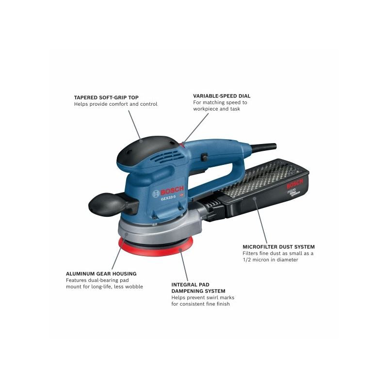 The Bosch GEX33-5 5 In. Multi-Hole Random Orbit Sander/Polisher features the ability to use virtually any brand of sandpaper on the market because of the multi-hole design. The sander still maintains optimum dust extraction to help ensure better quality of the finished workpiece’s surface. It also provides 2X sandpaper life due to increased efficiency. Its microfilter dust system filters fine dust as small as a 1/2 micron in diameter. The tool features a solid die-cast aluminum gear housing with exclusive dual-bearing pad mount, for less vibration. The variable-speed dial allows the user to match the speed of the sander to the workpiece and task, from 4,500 to 12,000 orbits per minute (opm). To ensure a strong grip of the disc while in use, it employs a hook-and-loop disc attachment system. The sander was designed with an ergonomic soft-grip top and body.