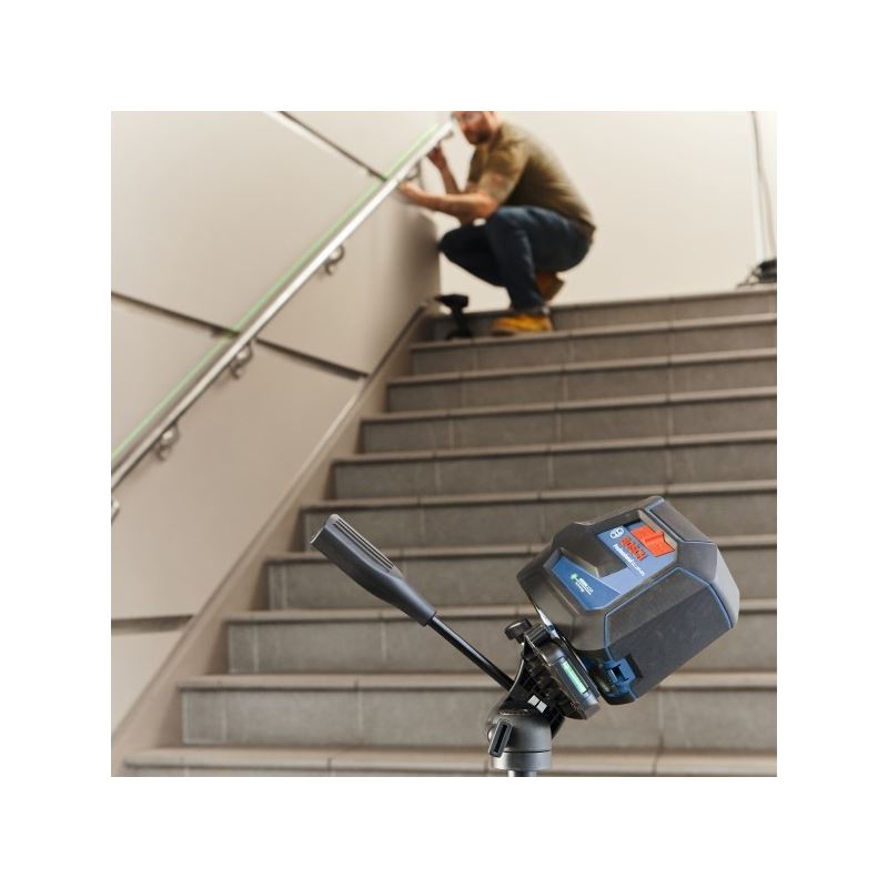 The Bosch GLL100-40G Green Beam Self-Leveling Cross-Line Laser uses green-beam technology, which emits green lines up to 4X brighter than standard red beams. This gives the laser a working range up to 100 Ft. The laser produces vertical, horizontal and cross-line modes, and the tool can project two lines independently or together, for a broad array of alignment and leveling applications. It includes Bosch-exclusive VisiMax technology, which monitors tool temperature and power consumption to deliver the brightest line for the job. The tool has full rubber overmold housing, designed to be similar to a roll cage, so every major impact point is reinforced with rubber. It is an IP64 rating, and features deeply recessed windows help protect the laser glass. The onboard user interface allows easy selection among the layout modes. The Bosch Smart Pendulum System self-levels and indicates out-of-level condition, and it locks the pendulum for secure transport. The included LB10 L-Bracket and DK10 ceiling clip offer quick setup and extra-strong magnets.