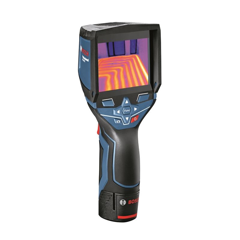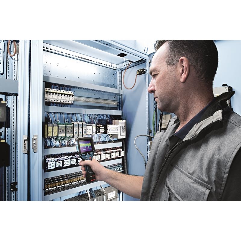 The Bosch GTC400C 12V Max Connected Thermal Camera is easy to use, determining temperatures in seconds and documenting the results with convenience. Featuring a large illuminated color display, it delivers a 16020 thermal graphic image accurate to 3degree C, setting the standard for detailed thermal resolution. It features simple operation; just squeeze the trigger to shoot image, and use the click wheel for the functions. The thermal graphic image features more than 19,000 measurement points for precision, showing hot and cold spots, the temperature at the center and an adjustable temperature scale. The integrated visual camera records actual images, so the user can document the work area visually as well as thermally. This allows side-by-side comparison, picture-in-picture and overlay of picture and thermal graphic. It can store up to 500 images. It's powered by the Bosch 12V Max battery platform for professional runtime. The user can then transfer the thermal documentation to a device with Bluetooth or WiFi hotspot with GTC software. The camera discloses problems in real time, without stopping production, and it is ideal for insulation, heater and radiator, windows and more.