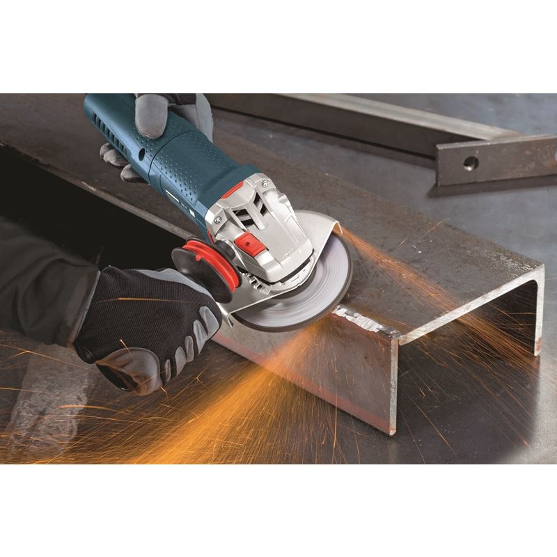 The Bosch GWS13-50VSP 5- In. Angle Grinder with Paddle Switch is a beefy angle grinder that provides a no-lock multi-grip paddle switch for user control and comfort. This grinder delivers 13 amps and up to 11,500 RPM of professional power. It has a lower variable-speed setting - 2,800 RPM - allowing the user to match speed to application. The paddle switch provides additional operator control. The tool is designed for long life, featuring directed air flow that diverts dust away from vital components. It is equipped with a two-position Vibration Control side handle, making it less strenuous to operate. The grinder has constant electronics for easy starts and dependable speed under load, and it has direct-motor cooling for higher overload capabilities. This tool provides security, with an integrated acceleration sensor to limit inadvertent recoil and restart protection to protect against unintended startup. It has a burst-protection quick toolless adjustable guard and a large spindle lock for a more convenient disc change. The Service Minderbrushes stop the grinder when preventative maintenance is required.