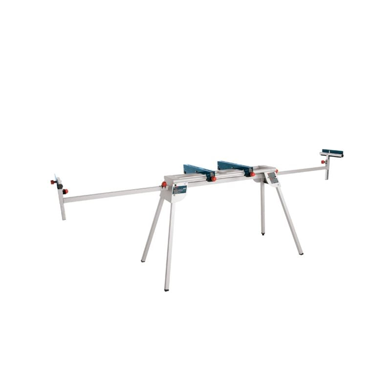 The Bosch T1B Folding-Leg Miter Saw Stand features Universal Quick-Action Tool Mounts, to fit most miter saws on the market. This includes fitting Bosch 12 In., 10 In. and 8-1/2 In. single- and dual-bevel miter saws, as well as many competitor miter saws. Once attached to the saw mounts, users can attach and remove the miter saw from the stand without tools. The stand has smooth end rollers that are adjustable in height to match the height of the user's miter saw. It features integrated repetitive stops. The dual sliding rails extend out to a total of 8-1/2 feet to support material up to 16-1/2 feet wide.