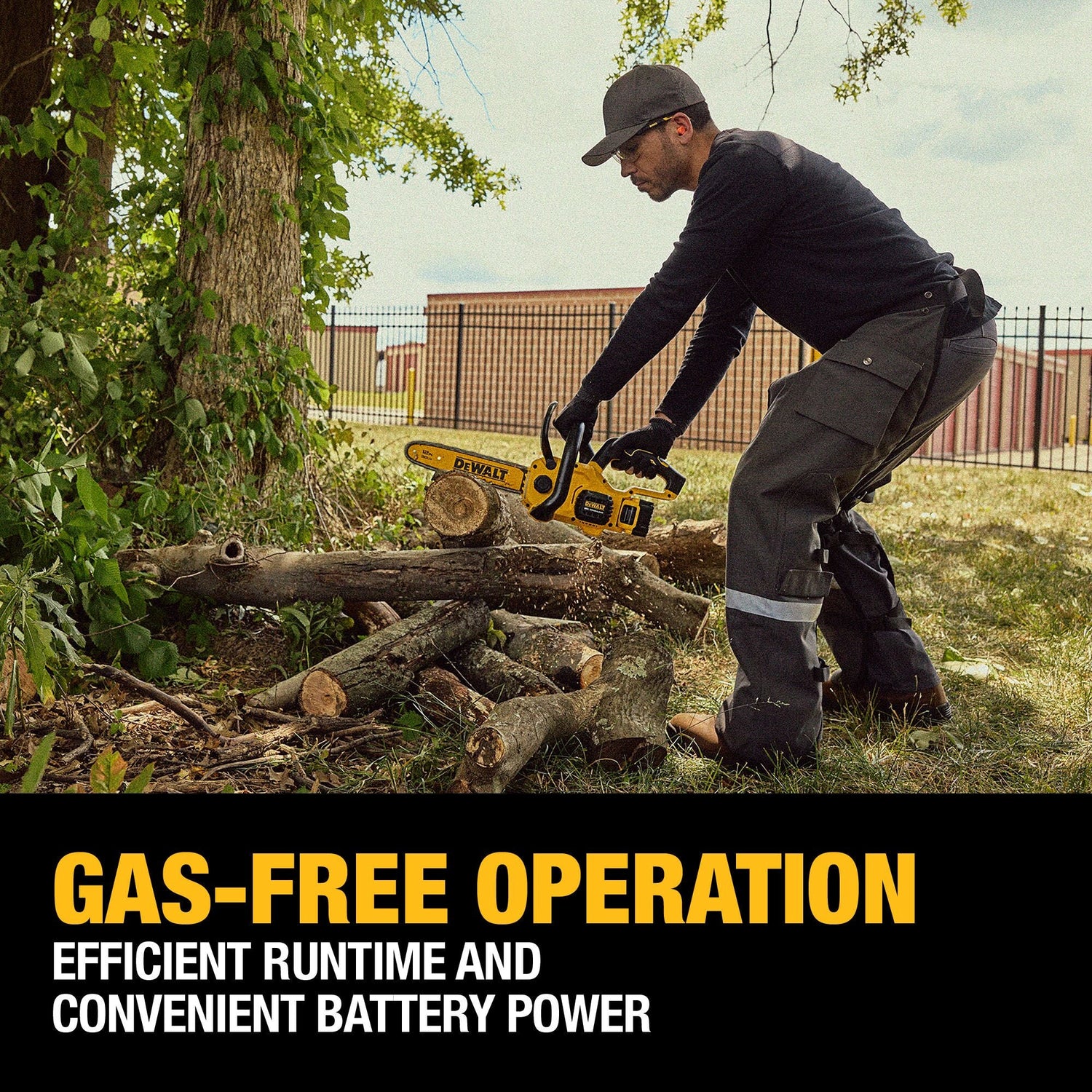 The 20V MAX* Compact 12 in. Brushless Cordless Chainsaw Kit delivers a gas-free operation that eliminates cold starts, fumes, carbuerator issues, and helps minimize maintenance compared to gas-powered chainsaws. This battery-powered chainsaw delivers up to 100 cuts per charge† and is designed for construction and outdoor jobs like cutting tree limbs and cutting beams. Lightweight design engineered to provide controlled cuts. This cordless, compact chainsaw features a high-efficiency brushless motor built to help maximize runtime. Powered by the included 20V MAX* battery, this chainsaw kit offers compact convenience and professional versatility.