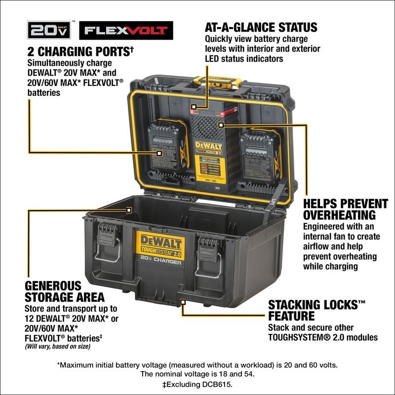 Charge, store, and transport your DEWALT 20V MAX and DEWALT 20V/60V MAX FLEXVOLT batteries in the innovative DEWALT TOUGHSYSTEM 2.0 Dual-Port Charger. Add this powerful, sealed charging box to your TOUGHSYSTEM modular storage to protect, store, and charge your DEWALT batteries. Featuring 2 ports for simultaneous charging and 2 USB ports for powering personal electronics, this durable storage box helps keeps you productive and your batteries safe on long days in harsh jobsite conditions.