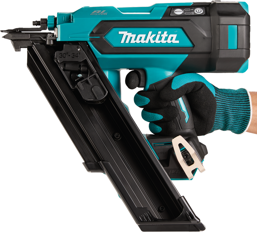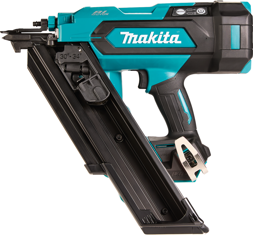 The Makita 18V LXT® 30° Clipped Head 3 1/2" Framing Nailer (DBN900ZK) drives clipped head nails into dense engineered lumber with the power of a pneumatic nailer. The DBN900ZK can drive up to 1,000 framing nails on a single charge of a 18V LXT® 6.0Ah battery (battery sold separately).