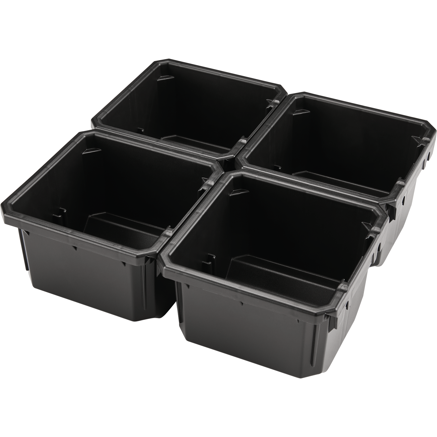 The Makita MAKTRAK™ Low-Profile Standard Organizer Bin Set includes four bins designed to maximize fastener storage and accommodate larger accessories. Crafted from impact-resistant copolymer, these bins offer durable protection for your tools. Wall-mountable hooks provide versatile organization options for any workshop, while convenient label slots enable quick and easy identification of contents. This set combines practical design and robust materials to enhance your workspace efficiency.