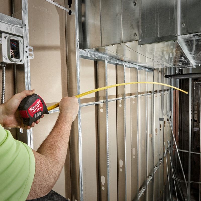 Our 25ft STUD Magnetic Tape Measure is the industry's most durable magnetic tape measure, equipped with innovative EXO360 Blade Technology. EXO360 protects your tape's blade from ripping and wearing, delivering the longest-lasting blade on the market. The tape delivers 17ft of reach allowing you to take long measurements on your own and reach further on the jobsite. The magnetic hook easily attaches to EMT and steel studs. Cutting-edge measuring tape blade technology, combined with a fully-reinforced impact-resistant frame makes STUD Tape Measures the most durable retractable tape measure for all your jobsite needs. STUD measuring tapes also features double-sided printing for easy reading as well as a finger stop to control blade retraction.