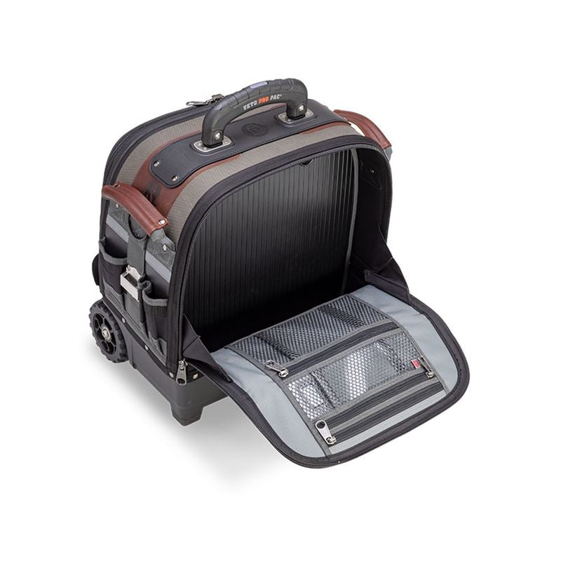 Large front and back zippered storage bays keep tools safe and secure