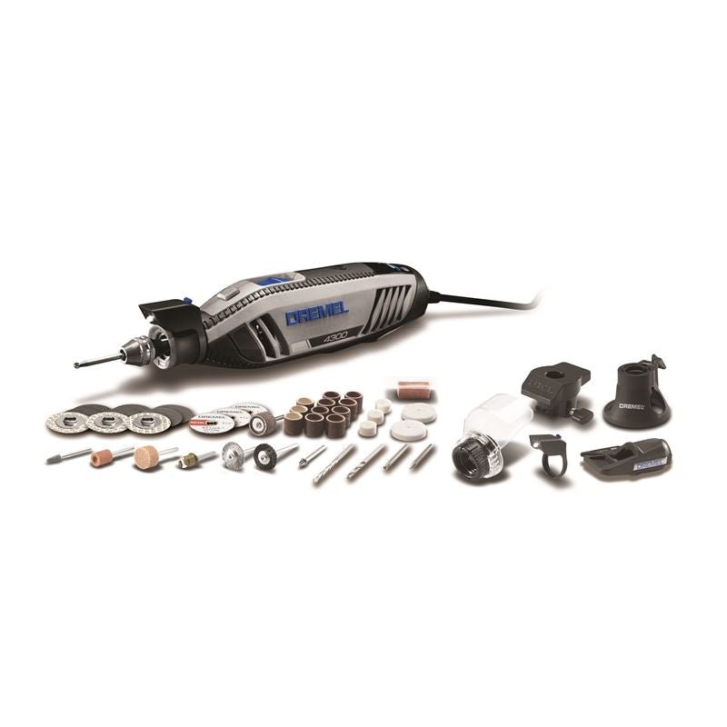 The Dremel 4300 is the first Dremel rotary tool to allow tool-less and collet-less accessory changes with the inclusion of the three-jaw chuck. The chuck accepts all Dremel accessory shank sizes for fast and convenient accessory changes without ever using a wrench. Featuring the all new Pivot Light, your projects are well-lit with an optimum line of sight since the light pivots to direct illumination where you want it. Experiencing the full range of Dremel rotary tool applications is easier than ever because the 4300 offers our most powerful motor with built-in variable speed and electronic feedback circuitry. And the slim, ergonomic body design provides a comfortable 360-degree grip zone no matter how you hold it for extended ease of use. The completely redesigned airflow system lets the Dremel 4300 run cool, quiet, and smooth so completing projects are more enjoyable than ever.