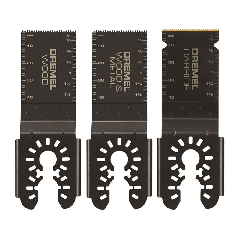 Three blade variety pack. Dremel universal oscillating accessories are the first truly universal oscillating accessories available that require no adapter! The unique dual interface fits all competitive oscillating tools, including those with a quick change feature. MM482U universal wood and metal blade may be used on non-ferrous metals, wood, plastic, drywall and other soft materials. MM480U universal wood blade may be used on wood, plastic, drywall and other soft materials. The Dremel MM485U universal carbide flush cut blade has high-performance carbide teeth designed to cut hard and abrasive materials like: nails, screws, stainless steel bolts, galvanized pipe, plaster and lathe, cement board, fibre board, sheet metal, slate, ceramic tile and more.