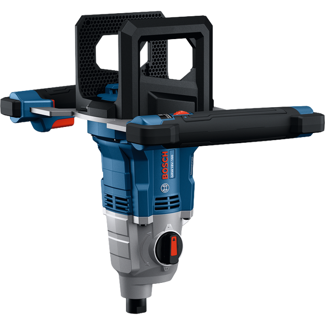The Bosch GRW18V-160 High Torque Mixer provides the strength and torque required for tough mixing jobs. Designed for heavy-duty materials like drywall mud, stucco, mortar, thin-set, and epoxy, it features 2-speed selections, delivering speeds of 0-530 RPM and 0-720 RPM for optimal performance. Easily adjust the speed to match the task at hand using the variable speed wheel for enhanced precision. Soft start technology minimizes splashing during startup for smoother performance. KickBack Control adds protection against unexpected movement in a binding situation when mixing tough materials. The ergonomic, dual-handle design helps provide maximum control for heavy-duty mixing applications while the rear-centered battery delivers optimal balance and improved comfort. An M14 x 2.0 threaded spindle provides a secure fit for M14 mixing paddles.
