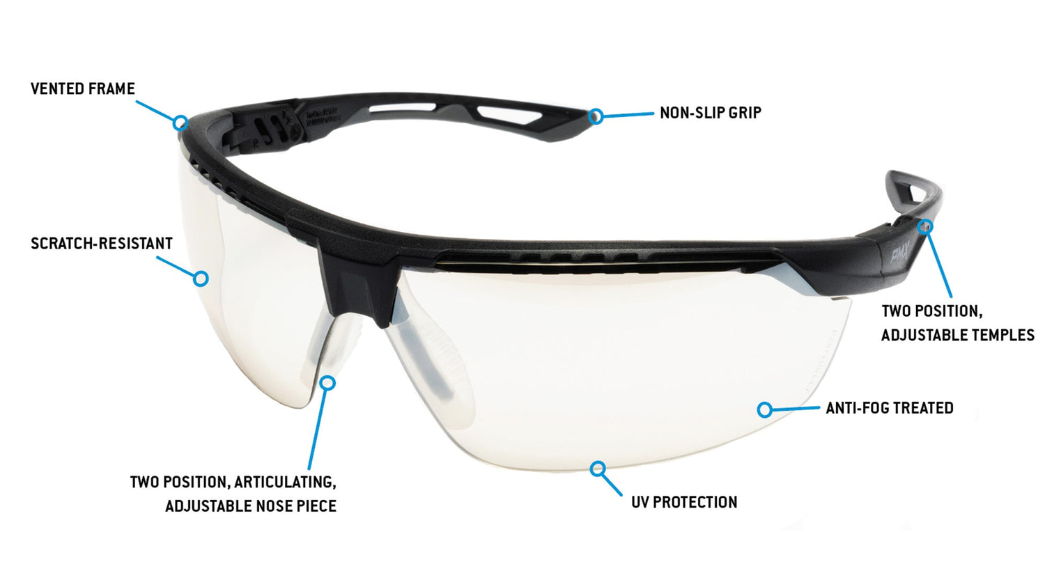 True Fit: Articulating, adjustable nose piece accommodates various nasal bridge sizes, ensuring optimal fit and comfort, while vented, adjustable temples allow for the perfect fit for side eye coverage and protection
