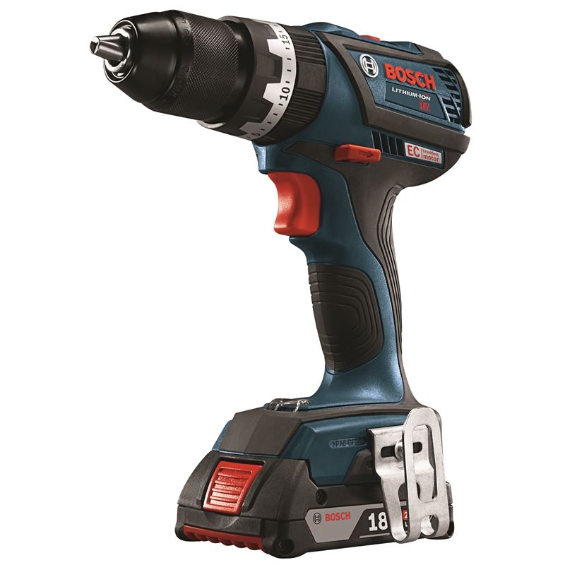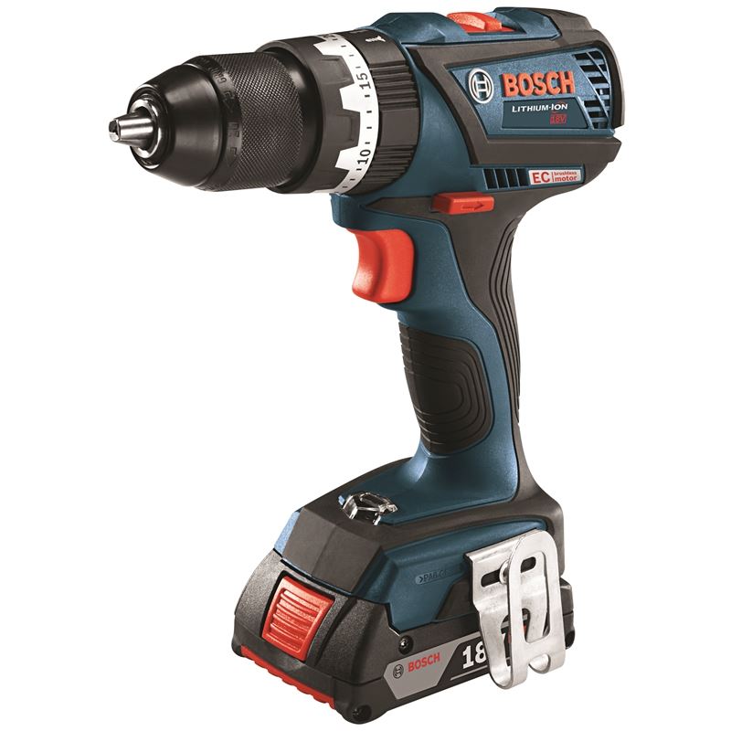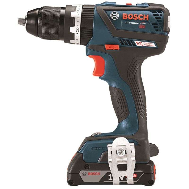 The Bosch HDS183-02 18V EC Brushless Compact Tough 1/2 In. Hammer Drill/Driver features KickBack Control, Bosch's integrated acceleration sensor that automatically shuts the tool down when a potentially dangerous rotational torque reaction occurs in a bind-up scenario. This reduces the risk of sudden tool reactions in binding conditions. The tool is engineered with an upgraded, heavy-duty all-metal chuck that allows for increased robustness and torque transfer. With an efficient EC Brushless motor, this drill/driver provides longer tool life as well as great runtime. One of Bosch's Compact Tough designs, it has a short head-length and light weight but plenty of muscle. It delivers a powerful performance, with 531 In.-Lbs. of torque, two drilling speeds (0-1,900 rpm for high speed and 0-600 rpm for high torque), an impact rate of 28,500 bpm for masonry applications and 20+1 precision clutch settings for reduced fastener damage. This tool provides an ergonomic grip zone and Bosch's Electronic Motor Protection and Electronic Cell Protection, to protect the tool and batteries from overload and overheating. It includes a long belt clip for a secure hold. The kit includes two 18V 2.0 Ah SlimPack batteries and a charger.