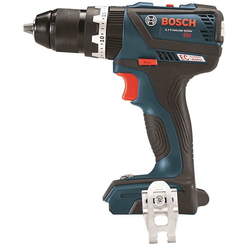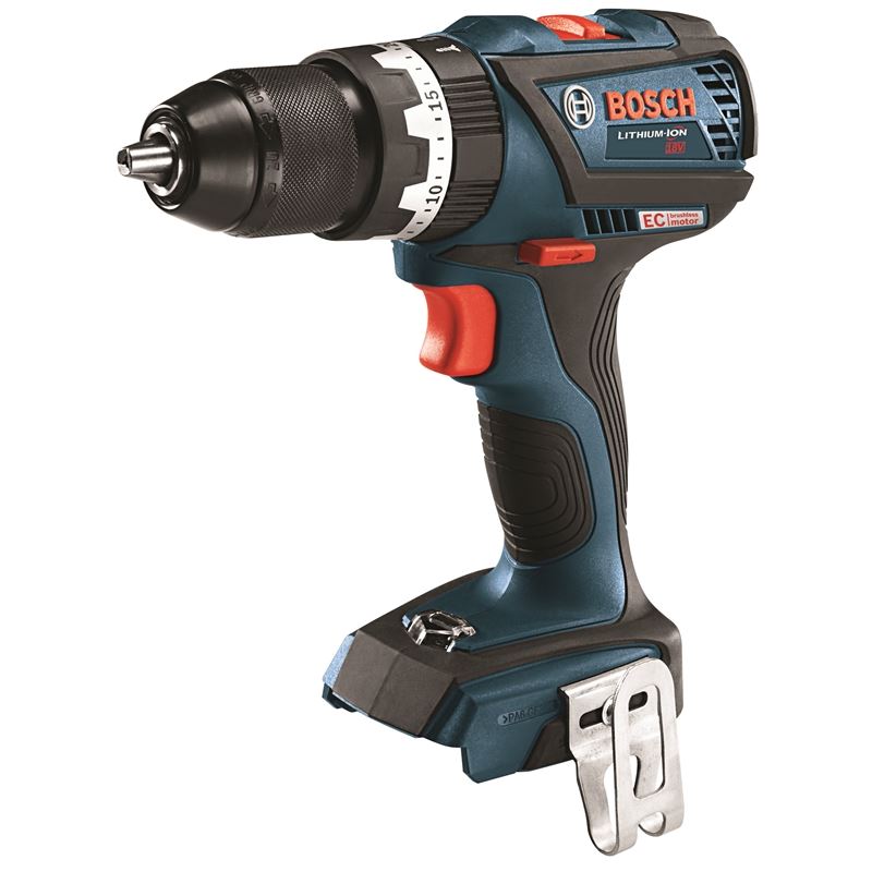 The Bosch HDS183B 18V EC Brushless Compact Tough 1/2 In. Hammer Drill/Driver is an efficient cordless tool with long runtime, and it features KickBack Control. This technology reduces the risk of sudden tool reactions in binding conditions. The integrated acceleration sensor automatically shuts the tool down when a potentially dangerous rotational torque reaction occurs in a bind-up scenario. The drill was engineered with an upgraded, heavy-duty all-metal chuck that furnishes increased robustness and high torque transfer. Its efficient EC Brushless motor delivers longer tool life as well as great runtime. One of Bosch's Compact Tough designs, it has a short head-length and light weight but plenty of muscle. It delivers a powerful performance, with 531 In.-Lbs. of torque, two drilling speeds (0-1,900 rpm for high speed and 0-600 rpm for high torque), an impact rate of 28,500 bpm for masonry applications and 20+1 precision clutch settings for reduced fastener damage. This tool provides an ergonomic grip zone and Bosch's Electronic Motor Protection and Electronic Cell Protection, to protect the tool and batteries from overload and overheating. It includes a long belt clip for a secure hold. This is a bare-tool kit; the battery and charger are sold separately.