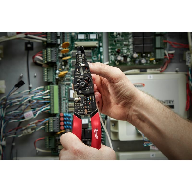 The Milwaukee multi purpose pliers provide the user ultimate versatility, from wire StripGaurd, cutting, and crimping to bolt cutting, the Milwaukee multi purpose pliers are the ultimate solution for the electrician. The cutting and stripping holes are positioned in front of the pivot to easily fit into tight spaces. The ergonomic handles and spring loaded design make this tool comfortable to use.