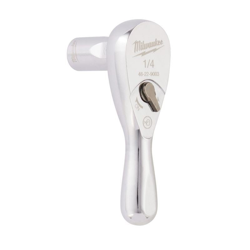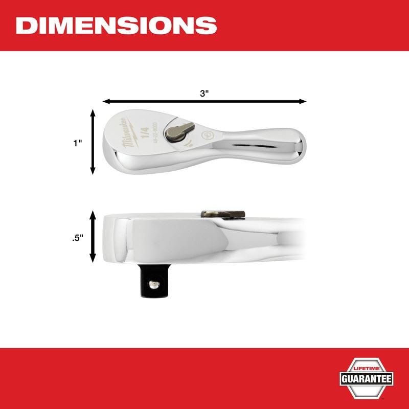 Our 1/4in Drive 3in Ratchet offers 4 degrees of arc swing, allowing access to work in tighter spaces. A slim-profile head and flush directional lever combined with the stubby handle length offers you increased accessibility. The all-chrome finish provides the MILWAUKEE ratchet with easy-cleaning. We back this ratchet with our Mechanics Hand Tools Lifetime Guarantee