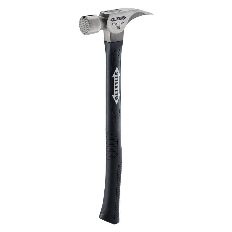 The STILETTO 16oz Titanium Fiberglass Hammer with Milled Face and 18in Curved Handle is more durable and has more prying strength than hickory handled hammers. This 16oz titanium hammer hits like a 28oz steel hammer with 45 percent less weight and 10x less recoil shock. It is recommended for rough framing and remodeling. The Titanium Fiberglass Hammer includes a magnetic nail starter and durable fiberglass handle with an ergonomic thumb divot