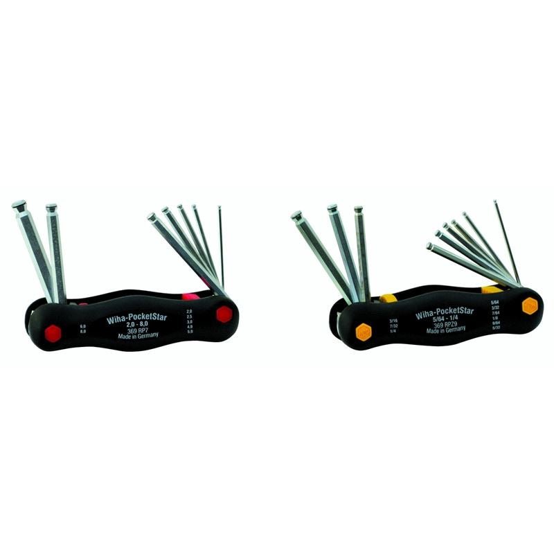 MagicRing Screw Holding Ball End Hex PocketStar Fold Out Inch 5/64, 3/32, 7/64, 1/8, 9/64, 5/32, 3/16, 7/32, 1/4in & Metric 2.0, 2.5, 3.0, 4.0, 5.0, 6.0, 8.0mm (2 Pc Set)Blades Ball End 2.0, 2.5mm, 5/64, 3/32, 7/64in MagicRing Ball End 3.0, 4.0, 5.0, 6.0, 8.0mm, 1/8, 9/645/32, 3/16, 7/32, 1/4in Wiha special chrome-vanadium-molybdenum tool steel Uses Hardened Steel Compression Ring Grips Inner Head Of Screw full radius contact Allows you a free hand for work positioning Through hardened for best wear resistance Handle Comfort formed molded ergo grips Reinforced with fiberglass Clever Push Button for fast key access