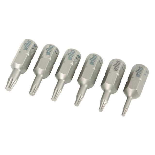 Torx Insert Bit T5, T6, T7, T8, T9 & T10 x 25mm (6 Bit Pack)Wiha premium bits - exact fit precision machined Universal fit for all standard bit holders & power tools Wiha special chrome-vanadium-molybdenum tool steel Torx is a 100% improvement in drive performance over other systems Virtually eliminates screw head cam-out Through hardened for best wear resistance