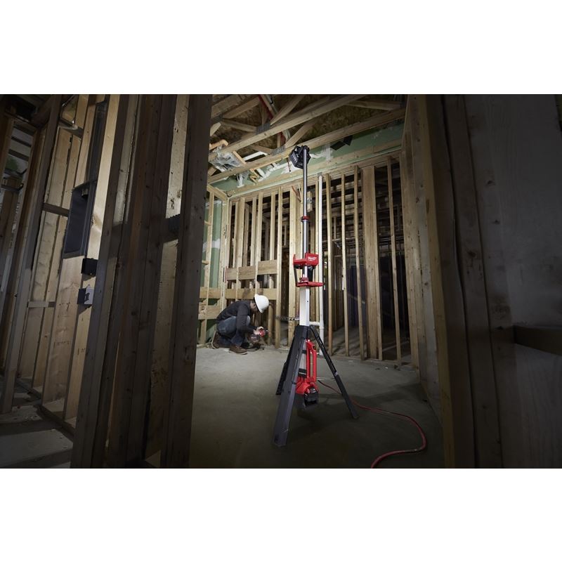 25% More light, all day operation. The M18 ROCKET dual power tower light is providing more light on the job with 2500 lm of TRUEVIEW hight definition output. All while having the capability being dual power, powered by M18 or extension cord. The light head can be extended from 4 to 7 Ft. to light overhead work or minimize shadows when casting light downward. Capable of filling large areas with light, it provides 2,500 lm in its high mode, 1,100 in. medium and 700 in. low, and it can run for up to 4, 8, or 12 hours with an M18 REDLITHIUM XC 5.0 battery pack. It uses TRUEVIEW high definition output providing neutral white color and a high color rendering index paired with a Milwaukee designed reflector to produce an even beam pattern. Its reinforced legs are impact resistant, and its low center of gravity provides a stable base. The light head is protected by an impact-resistant lens and bezel, and it nests into a protective shroud for secure transport and storage. Its LEDS never need to be replaced, and are backed by a Limited Lifetime Warranty. The combination of these technologies offers professionals the highest quality LED lighting solution, on or off the jobsite.