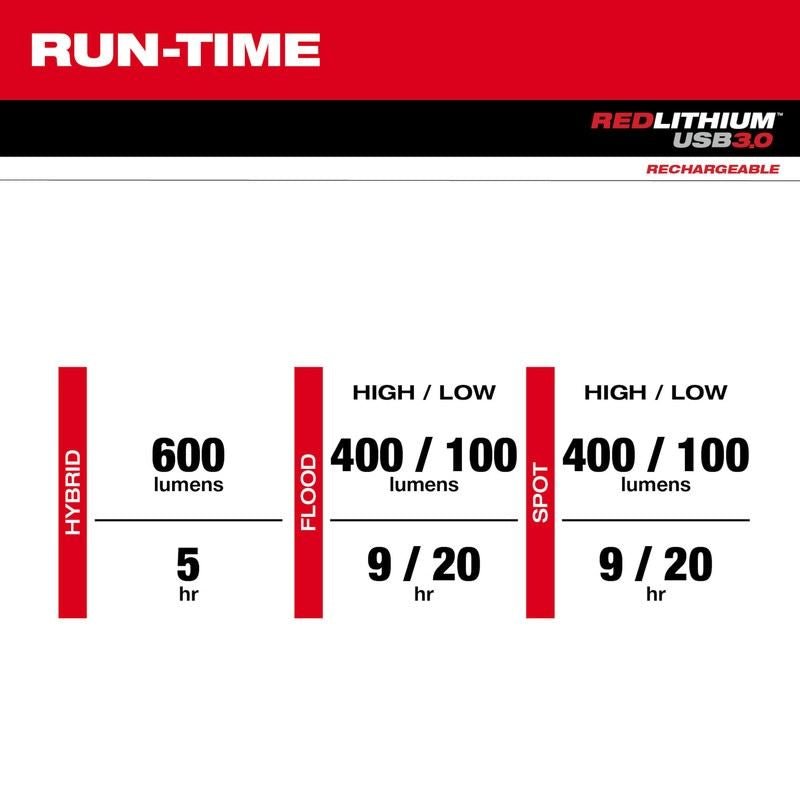 5 Output Modes: Hybrid: 600 Lumens = 5 Hours, Flood High: 400 Lumens = 9 Hours, Flood Low: 100 Lumens = 20 Hours, Spot High: 400 Lumens = 9 Hours, Spot Low: 100 Lumens = 20 Hours