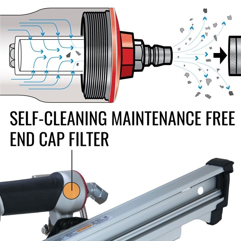 SELF-CLEANING FILTER FOR RELIABLE OPERATIONS: The patented, self-cleaning maintenance free end cap filter captures foreign substances before they can enter the tool and automatically ejects them when the air hose is disconnected.