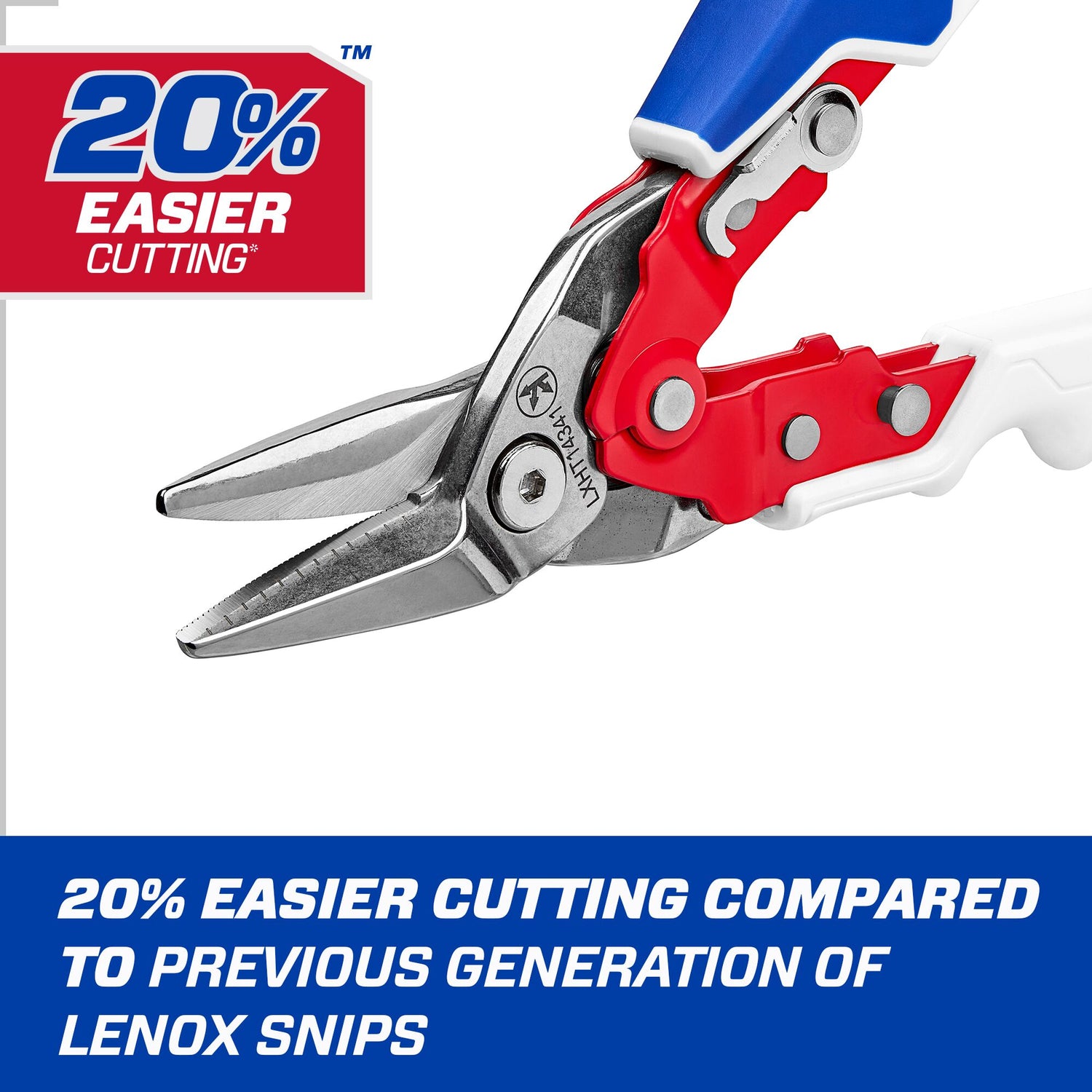 The LENOX® Aviation Snips feature improvements that any Pro will notice and appreciate. The enhanced mechanical advantage not only makes it 20% easier* to cut than the previous LENOX® snips, but also maximizes the cut length relative to hand span to maximize cut per squeeze; two very important features when cutting sheet metal. The enhanced finished process on the blade prevents material catching when cutting, and the patented blade connection on the pivot bolt prevents loosening and blade separation--a common frustration that prematurely sends snips on the market to the trash. Identifying color coating on both the body and handle-ends allows end users to quickly spot which snip it is (left, right, or straight) in both the toolbox and pouch. Improved ergonomics combined with an added elastomer grip on the backside handle provides comfort and stability. A smooth texture on the other handle allows the fingers to slide when squeezing providing power and ease of use.