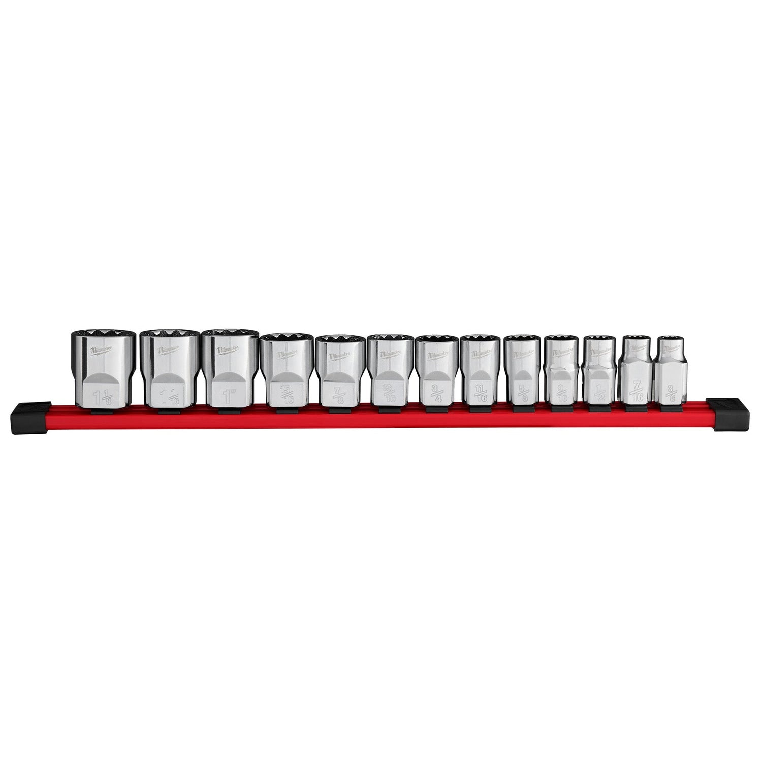 Our 13pc 1/2" Drive 12-Point SAE Socket Set with FOUR FLAT™ sides is designed from the ground up to be part of the most versatile socket family. Milwaukee® sockets feature an innovative design with four parallel flat sides, which deter rolling and are wrench compatible. The laser-engraved size markings provide easy identification, and chrome plating offers rust and corrosion protection. This set includes a storage rail for better organization. All Milwaukee® sockets are backed by a Lifetime Guarantee.