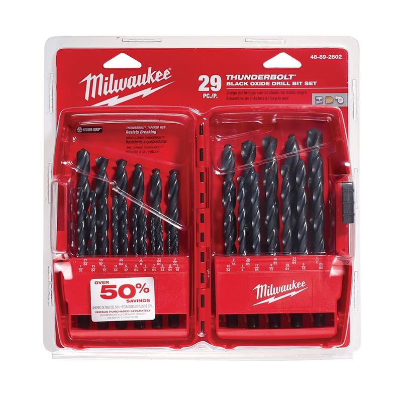 Our THUNDERBOLT Black Oxide Jobber length drill bits are designed for extreme durability and long life. The MILWAUKEE THUNDERBOLT web features a thicker core than a standard drill bit to provide ultimate strength and protection against side-load breakage. A specially designed parabolic flute form clears chips and debris fast to keep the bit cool. The 135 DEG Split Point tip starts on contact to keep the bit from walking for fast, accurate holes. Our drill bits are excellent for drilling on curved surfaces and require less effort to drill perfect for work with portable drills. The 3-Flat Secure-Grip shank won't slip in the drill chuck and there is a reduced shank diameter for use in 3/8in chucks. The 29-Piece THUNDERBOLT Black Oxide Drill Bit Set comes with: 1/16in through 1/2in by 64ths.