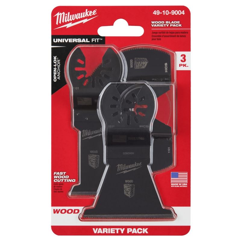 Our Universal Fit OPEN-LOK 3-Piece Wood Cutting Oscillating Multi-Tool Variety Pack offers you an assortment of our next-generation oscillating blades for optimal cutting performance in wood, PVC, drywall, and other soft materials. The oscillating wood blades are designed with aggressive, precision ground teeth for fast cuts in wood, drywall, and PVC. A 1-3/8 in end-cut blade, a 2-1/2 in end-cut blade, and 3-1/2 in segmented blade offer versatile cutting to ensure you have the right blade for the right cut. This MILWAUKEE oscillating tool blade variety pack is designed and made in the USA with global materials. Includes: (1) 1-3/8 in HCS WOOD BLADE, (1) 2-1/2 in HCS WOOD BLADE, (1) 3-1/2 in HCS SEGMENTED WOOD BLADE