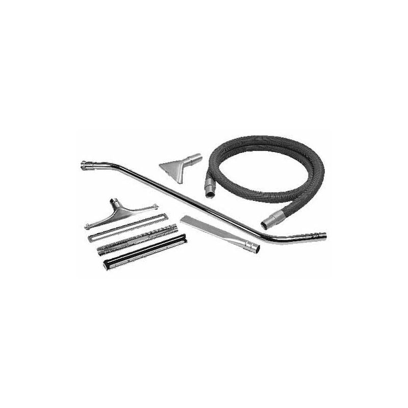 The Kit is designed with the maintenance department in mind. The kit includes one each of the following, 49-90-0060 10 Foot Vinyl Hose, 49-90-0550 Major Floor Tool, 49-90-0580 Squeegee Shoe, 49-90-0400 15" Crevice Tool, 49-90-0600 14" Carpet Insert, 49-90-0740 Utility Nozzle, 49-90-1000 Double Bend Floor Wand Hose is 1-1/2" I.D. All attachments are of metal construction, Not plastic.