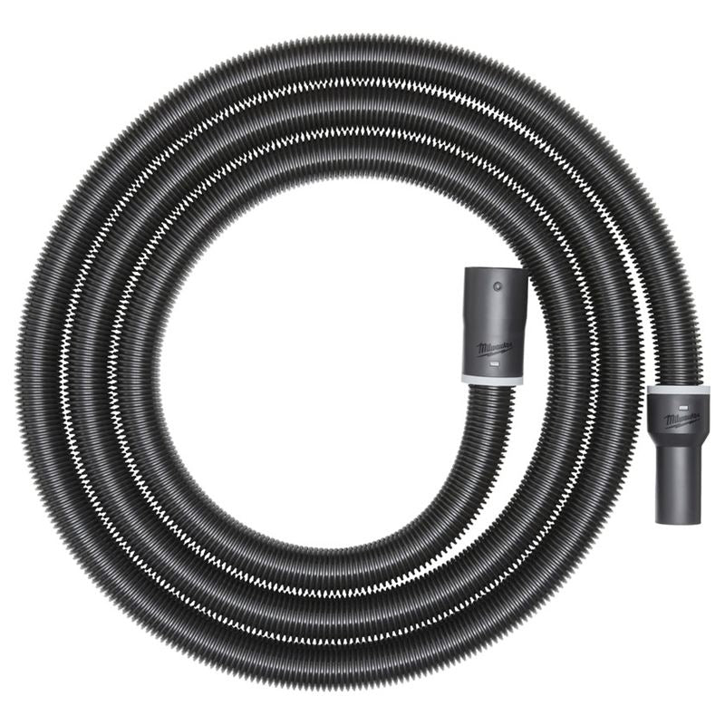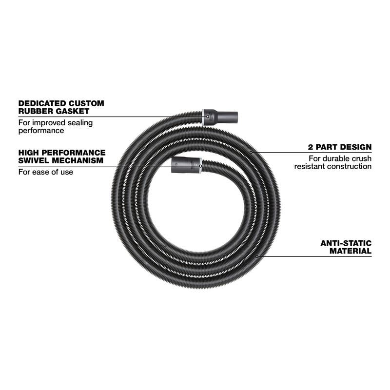 Our 1-7/8in x 16' Flexible Hose delivers unmatched durability and flexibility to survive the jobsite. Its two-part design allows for durable and crush-resistant construction to prevent tears that lead to downtime on the jobsite. The anti-static hose material helps prevent static buildup when cleaning fine particles. The high-performance swivel mechanism and hose material create more flexibility and ease of use during cleaning, preventing the hose from getting bound up or kinked while you move around. The dedicated custom rubber gasket improves airflow and performance when in use. This MILWAUKEE flexible vacuum hose has extended length compared to included stock hose (49-90-1996) and includes a gray color ring for quick identification of its 1-7/8in diameter.INCLUDES: