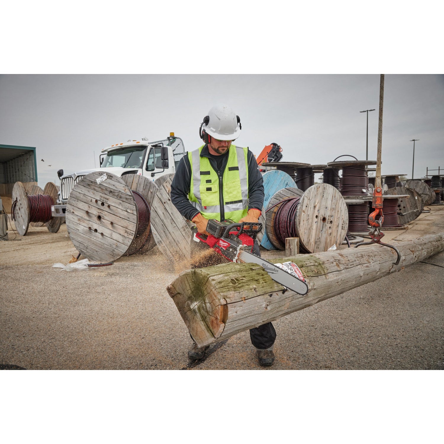 Our M18 FUEL™ 20” Dual Battery Chainsaw generates 70cc Power, delivers faster cutting through reduced stalls, and provides users a balanced design for more control. The saw is designed to meet the performance, durability, and ergonomic needs of the professional chainsaw user. M18 FUEL™ technology allows this saw to generate 5.8HP peak power, enabling users to take on demanding applications. The POWERSTATE™ Brushless Motor gets up to speed in under one second and maintains speed under heavy loads without bogging down to outperform gas and high-voltage competitors. The power mode select feature enables users to run the saw in Standard Power Mode with 4.4HP or Peak Power Mode with 5.8HP giving users increased control over power output. Standard Power Mode maximizes run time and runs cooler, while Peak Power Mode provides maximum power to prevent stalls in the toughest applications. REDLINK PLUS™ Intelligence enables full-circle communication between the saw and battery, providing unmatched levels of performance, protection, and productivity. Optimized for use with (2) REDLITHIUM™ FORGE™ XC 8.0 batteries, this saw delivers up to 60 cuts per charge in 10” hardwoods. The saw’s balanced design and professionally demanded feature set enable more control in application. The saw features dual metal bucking spikes, high visibility felling sight lines, power mode select button, dual captured bar nuts, and onboard scrench storage. Fully compatible with 250+ solutions on the M18™ system.
