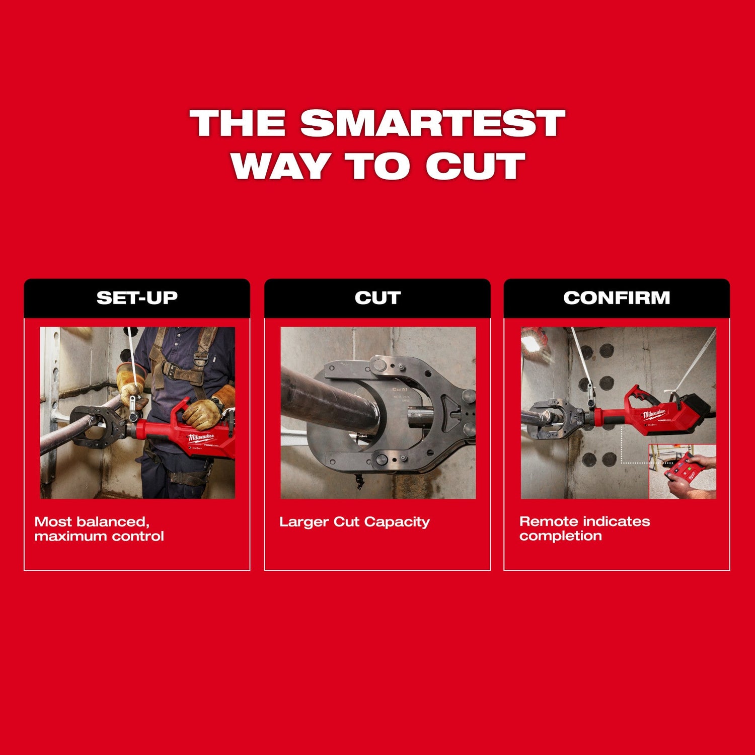 Our M18™ FORCE LOGIC™ 5" Underground Cable Cutter w/ Wireless Remote is The Smartest Way to Cut. We remove the physical connection to the tool, allowing Cable Splicers to cut up to 5” (127 mm) Diameter Communications, Armored, Lead Sheath, Copper, and Aluminum Power Cables wirelessly. The wireless remote communicates with the tool via a mutually exclusive connection, eliminating the potential for other smart devices to connect to the tool. After set-up, Cable Splicers can arm the remote cutter and move away from the cutting area. A green LED on the wireless remote gives a positive indication that the tool is done cutting, delivering a safer way to cut remotely. The M18™ FORCE LOGIC™ 5" Underground Cable Cutter w/ Wireless Remote easily converts from Local to Remote cutting mode. Its balanced design, d-handle, and hang hook enable the easiest set-up in vaults. The head of the cutter rotates 180° and the quick turn-to-close style latch pin is easily opened or secured. Whether cutting remotely or locally, Milwaukee® delivers an optimized cutting experience.